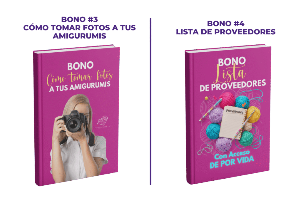 En el Bono #3 aprenderás cómo tomar fotos de amigurumis que luzcan como hechas por un fotógrafo profesional;mientras que en el Bono #4 tendrás una lista de los mejores proveedores de artículos para crochet en tu país.