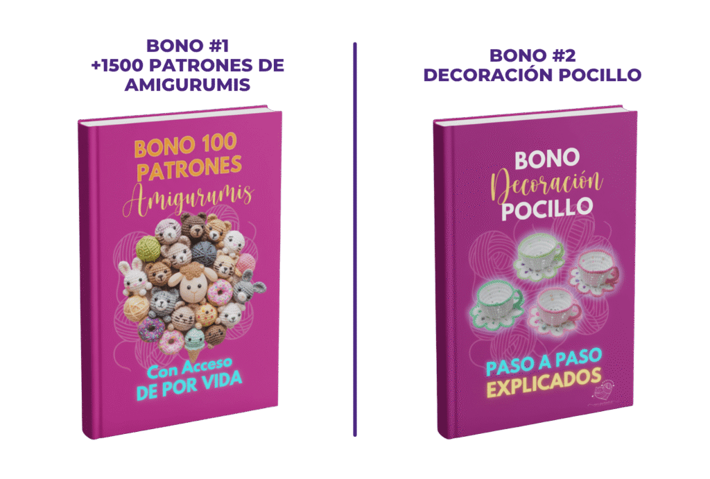 En el Bono #1 tendrás 100 patrones con acceso de por vida, para que nunca te quedes sin ideas al tejer;mientras que en el Bono #2 recibirás un tutorial para decorar tus pocillos favoritos del desayuno.